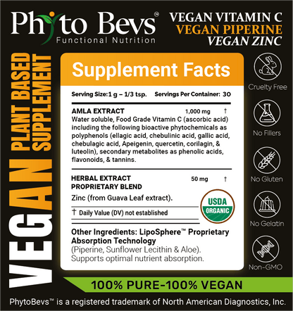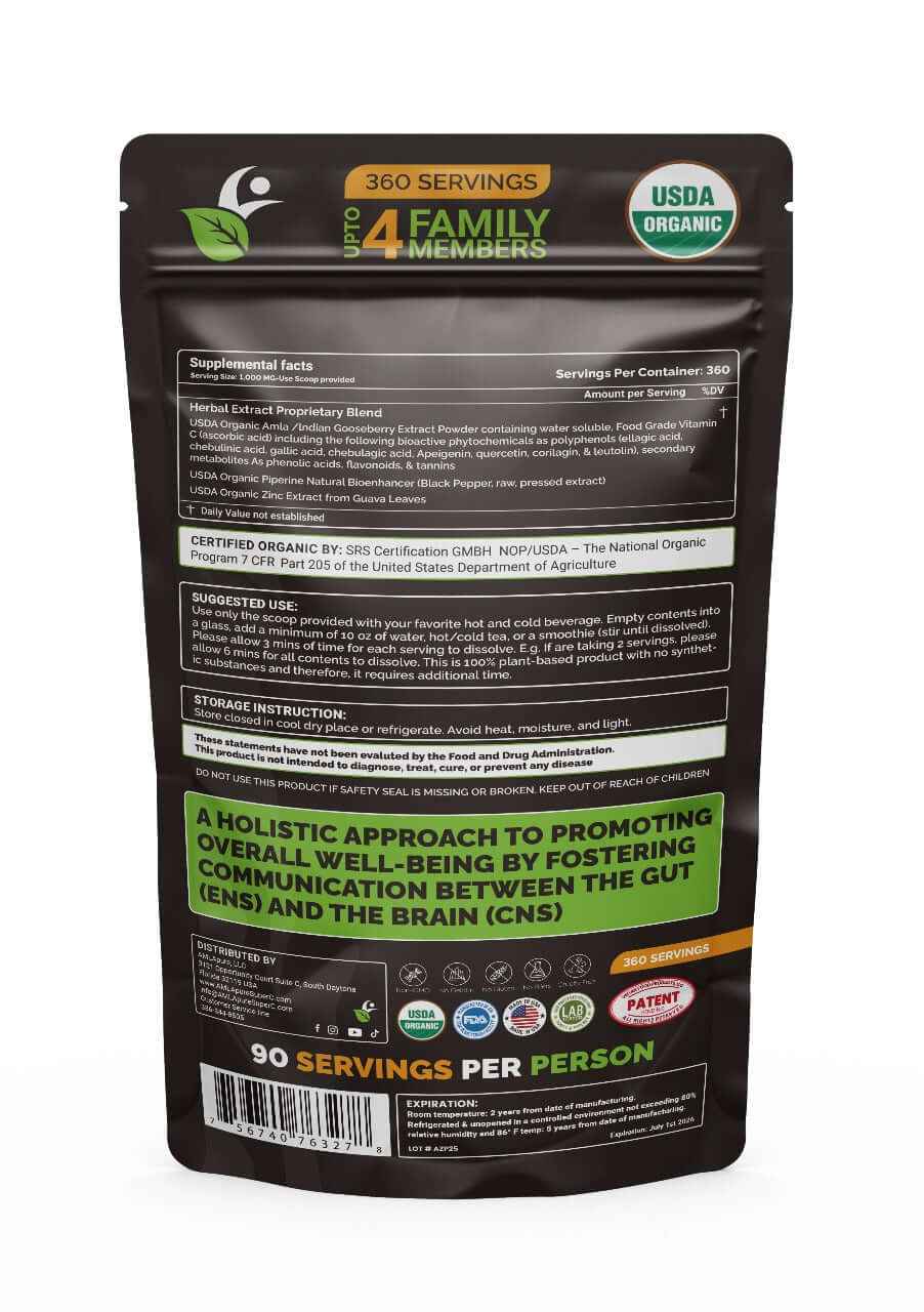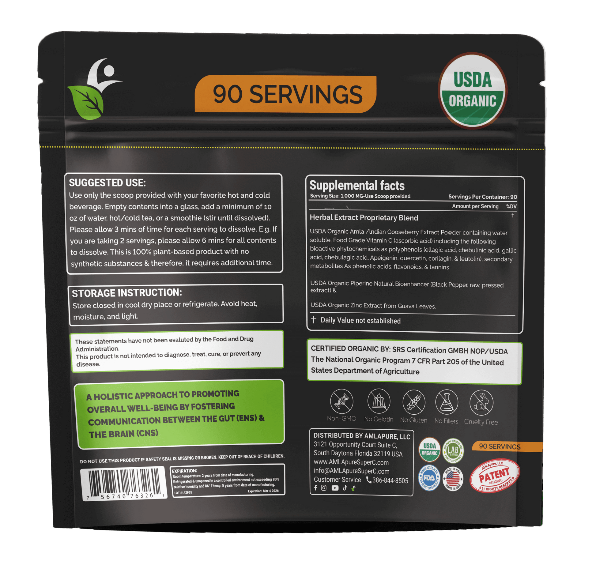 This thoughtfully crafted blend features USDA Organic Amla (Indian Gooseberry) and Guava Leaf, both natural sources of Vitamin C and essential co-factors. For enhanced nutrient absorption, we’ve included Piperine (Black Pepper Extract).